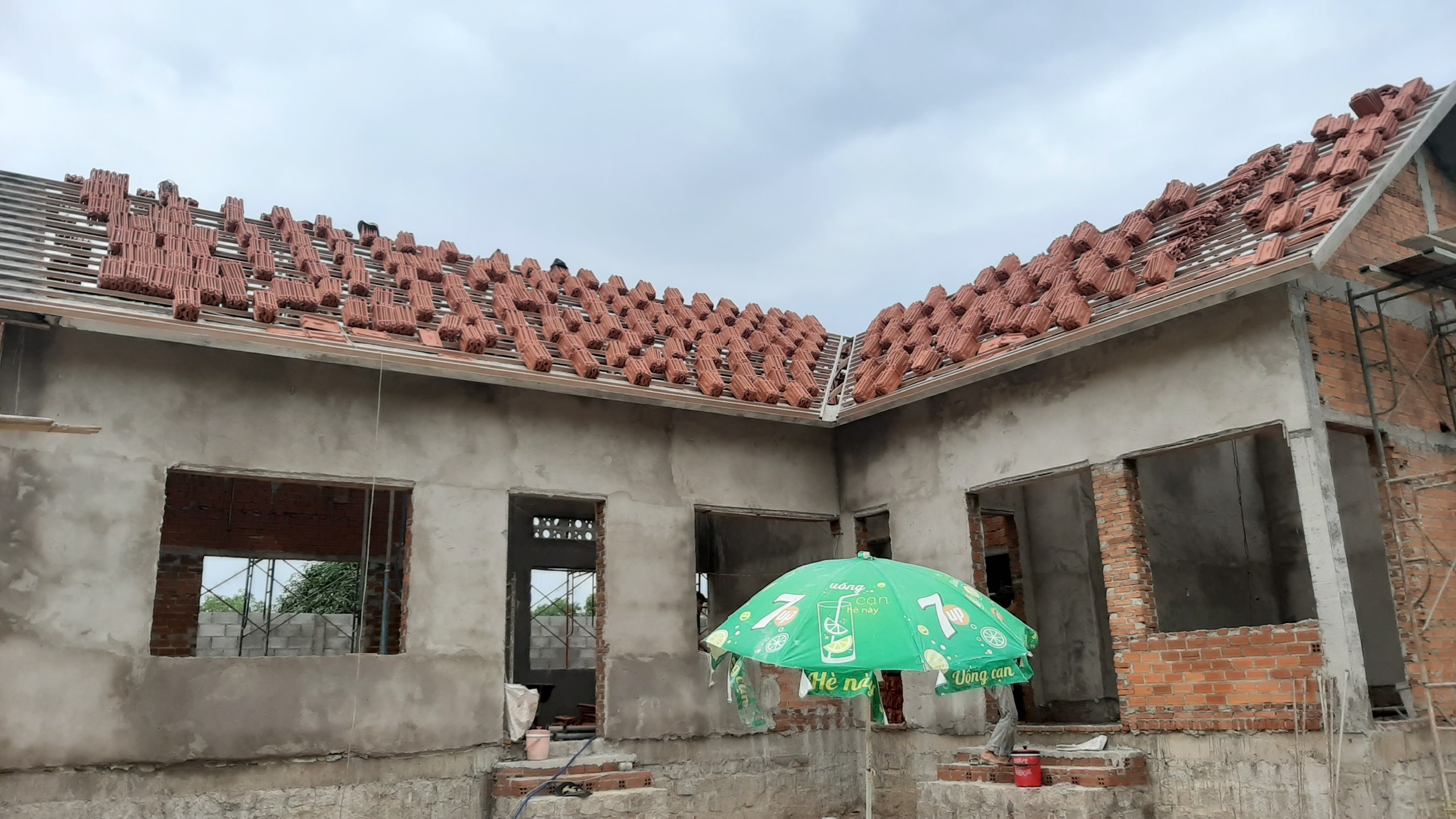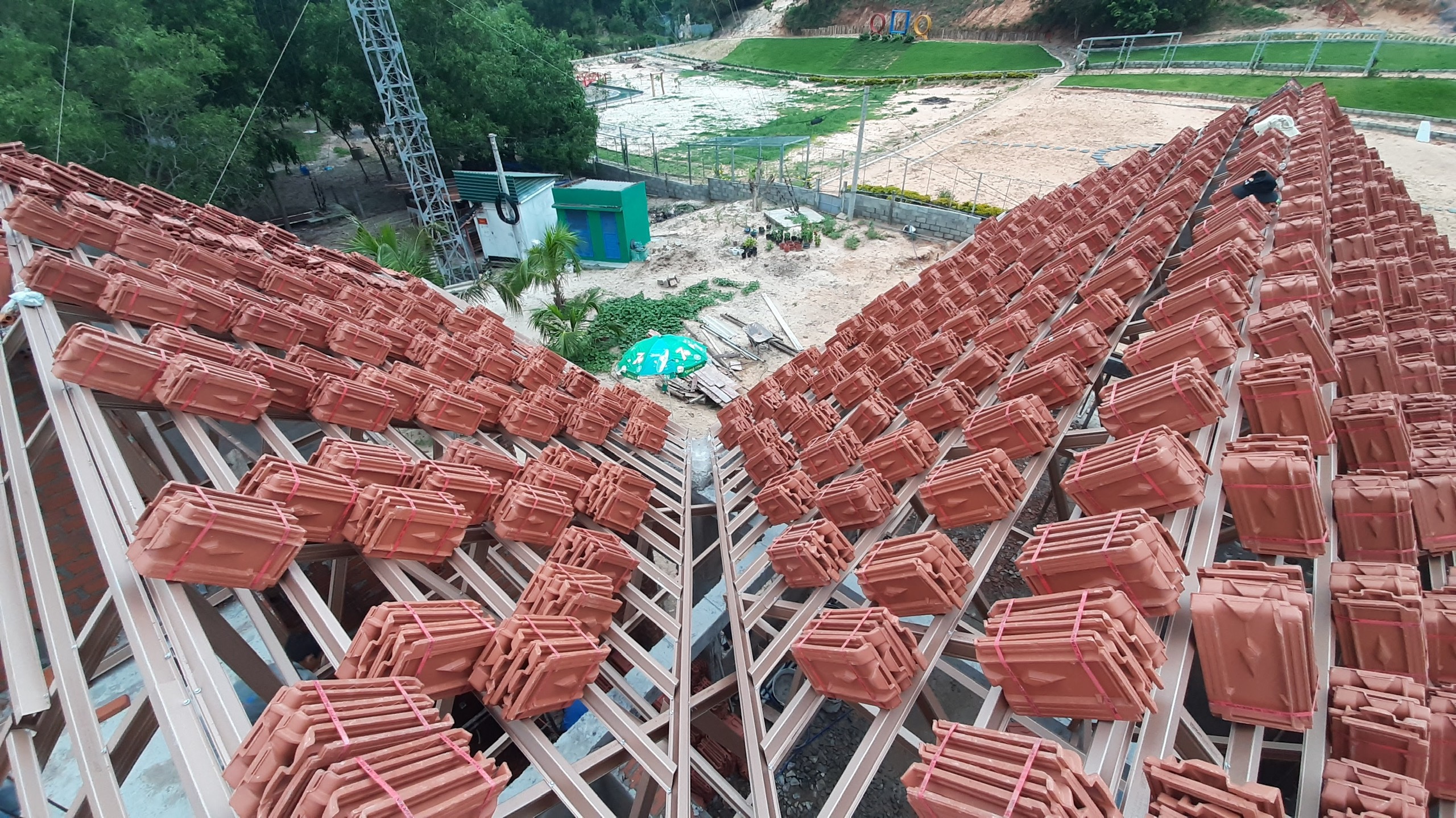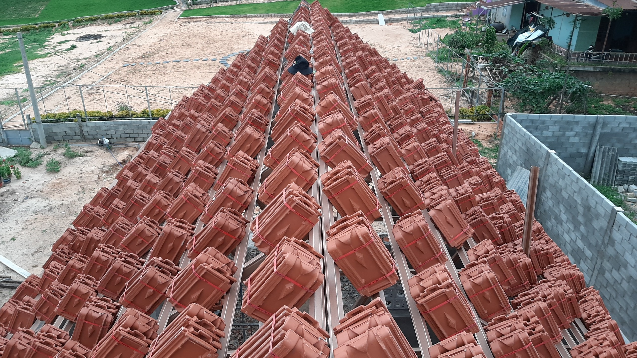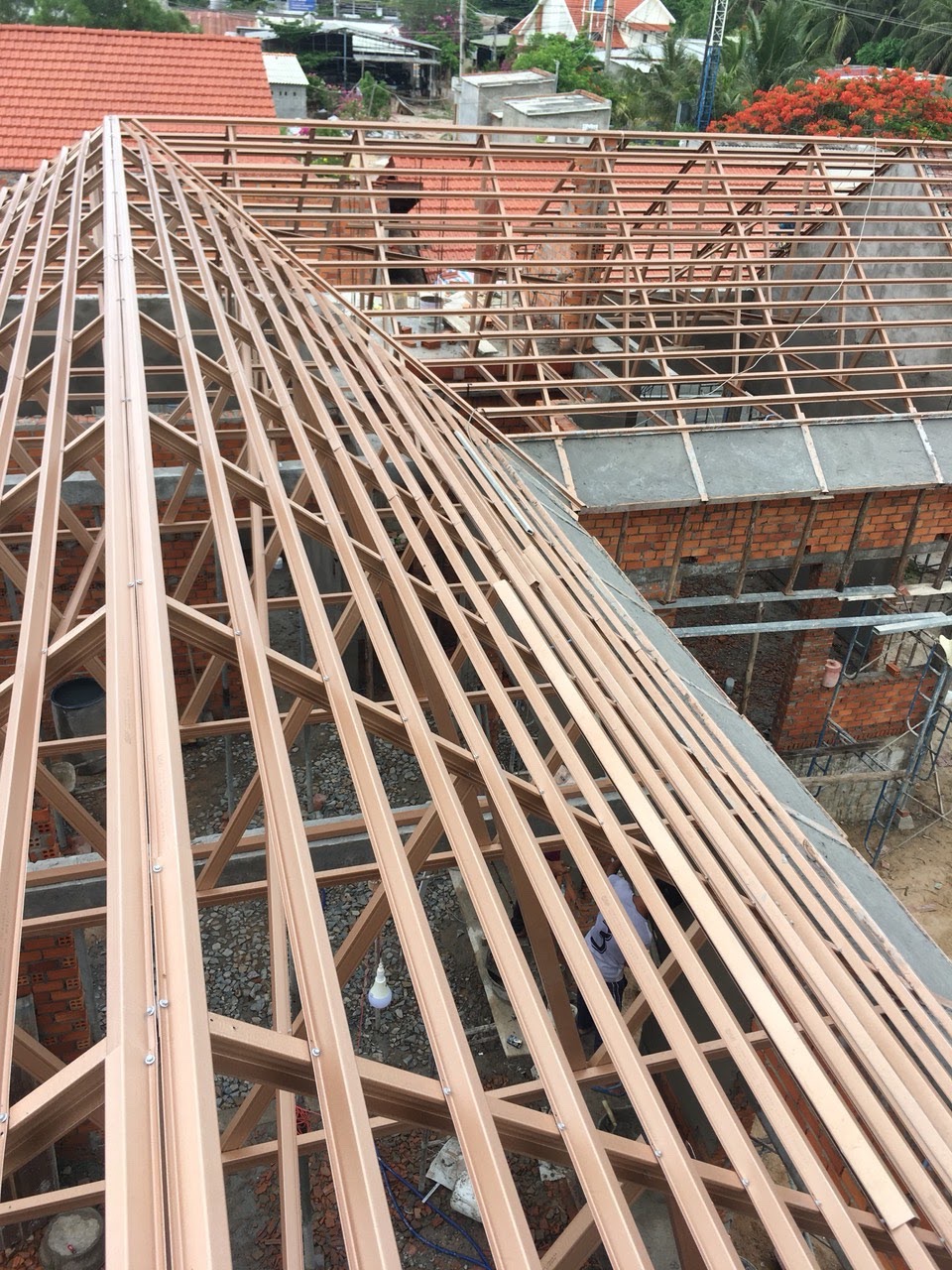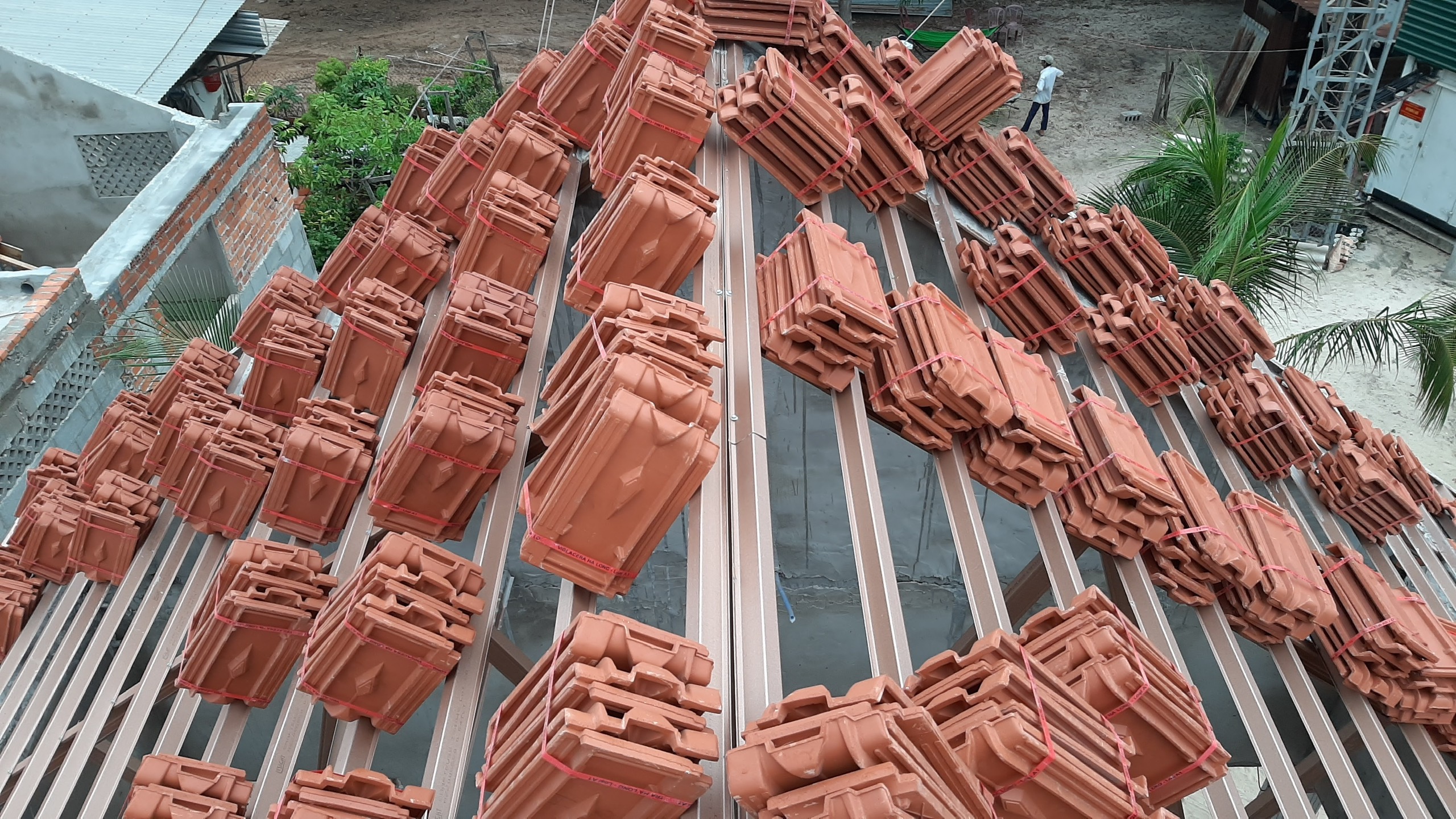 Diện tích mái 199m2 sử dụng hệ khung kèo Smartruss Az200 và ngói Hạ Long 22v/1m2 loại A1.